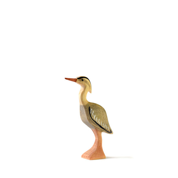 This gorgeous Grey Heron from Bumbu Toys is a handmade wooden bird figure with a grey body and salmon/orange details on the head and feet.